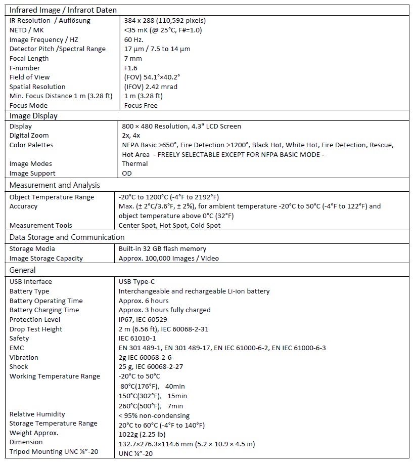 It is equipped with image support and many features. There is always the possibility to use photo and video recordings or the freeze function. In addition to the different image modes, which supports the user in his various activities. It has a 2x and 4x zoom, together with the Black White (BW) mode, this can optimally support you in a person search. The Hot and Cold Tracker provides the user with important information at all times. The display with 4.3", 60Hz., resolution of 384x288, the value of 35 mK (0.035C°), a display of 650°C or up to 1200°C and the OD system guarantee you a clear and detailed image display at all times. The IP67, 2 mtr. Drop test, 260 °C with up to 7 minutes working temperature range, reliably ensure the user can use the F120 even under the most extreme conditions.